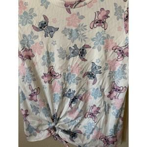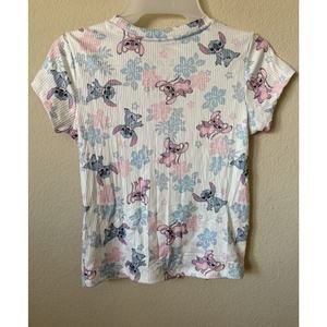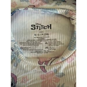 Disney Lilo & Stitch Cream Blue Pink Stitch Angel Hibiscus Flower Crew Neck Short Sleeve Girls’ Ribbed T Shirt Top Size S 7/8 Small 7/8