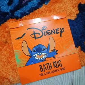 Vibrant orange bath rug featuring Stitch with blue and purple accents. Perfect for adding a playful touch to your bathroom decor.
