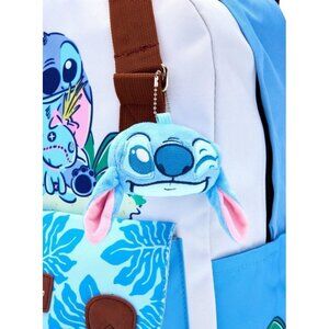 The Disney Stitch Color Block Backpack Plush Charm in blue and white features a rectangular shape with a zip closure and brown handle/strap. This mini backpack is perfect for casual occasions and includes inner and outer pockets, an adjustable strap, key clip, and zip-around closure. The bag is adorned with a Stitch character charm from Disney, making it a fun and stylish accessory for unisex adults. Made from polyester, nylon, and polyeurathane, this backpack also includes a keychain and is ideal for fans of Disney and colorful patterns.