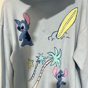 Cozy light blue hoodie featuring Stitch designs throughout.