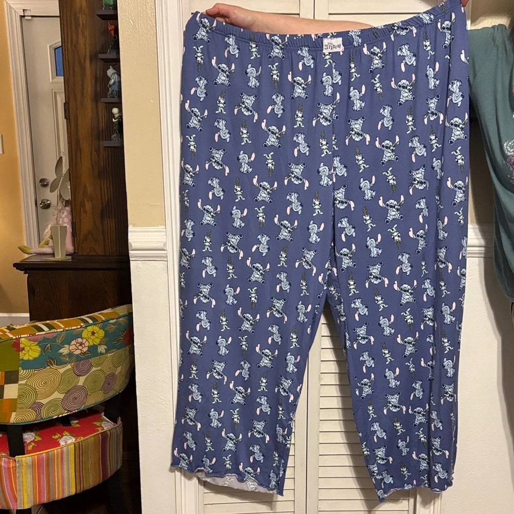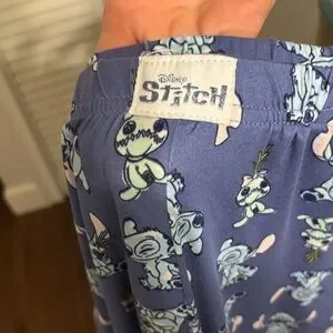 Disney Stitch print lounge pants. Playful character pattern across fabric. Comfortable elastic waist. Casual wear for fans. The inseam is about 26 in.