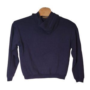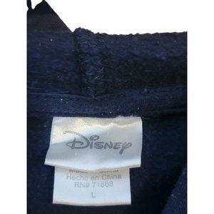 This Disney Stitch Ohana hooded sweatshirt in navy blue is a unisex size large. It showcases a playful Stitch design, perfect for Disney fans. The hoodie offers both comfort and style.
