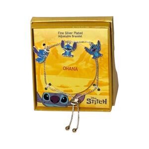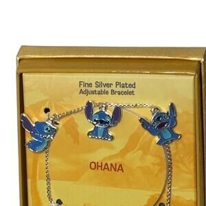 Stitch Ohana Silver Plated Charm Slider Bracelet by Disney. New in Box. Excellent Unused Condition. Celebrate the magic of Disney with this brand new in gift box Stitch “Ohana” charm bracelet. Beautifully crafted in silver plating, this adjustable slider bracelet is designed with a delicate charm that honors the Hawaiian spirit of Ohana — meaning family, love, and togetherness.