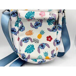 This compact crossbody bag features a vibrant Stitch tropical print, ideal for carrying essentials. Adjustable strap and zip closure ensure functionality and style.
