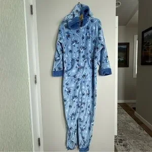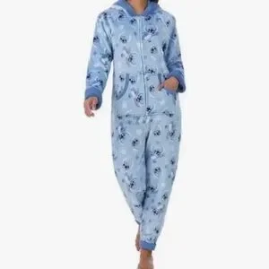 Soft hooded onesie with front zip and pockets. All-over Stitch print. Ribbed cuffs and ankle hems for comfort. Lightweight, cozy lounge piece.