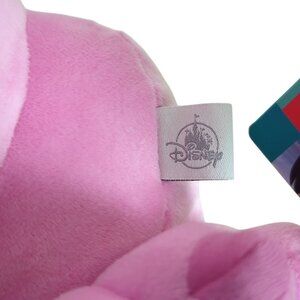 Adorable Disney Store Angel plush, featuring Experiment 624 from Lilo & Stitch. This plush is super soft with bright pink and lavender coloring, large embroidered eyes, a heart-shaped patch on the back, and a plush white heart on the chest. Original Disney Store tag and sewn-in labels are still attached.