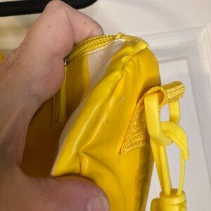Yellow, Mickey Mouse theme, lemon shaped, soft sided cooler by Disney. The zip close cooler is shaped like a lemon wedge with Mickey Mouse heads where the seeds would be. It has 2 handles and an adjustable shoulder strap. The inside has all the Disney authentication tags. I believe it is a park exclusive and not sold outside of Disney parks and resorts.