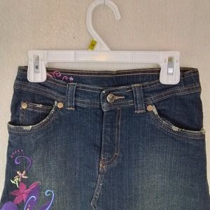 This skirt is from the Disney Princess Line. It features 5-pockets, adjustable waist, and raw hem. This jean skirt has a Tinkerbelle theme with patches and embroidery throughout. This skirt is preloved and still in excellent condition with no major flaws and no signs of wear.
