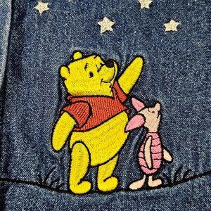 This denim shirt features iconic Winnie the Pooh characters embroidered on the front, crafted in a comfortable medium fit with 100% cotton material.