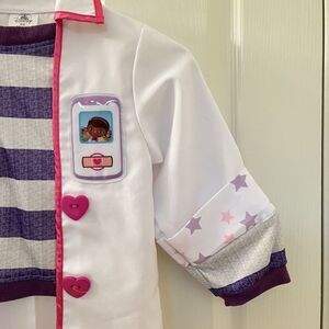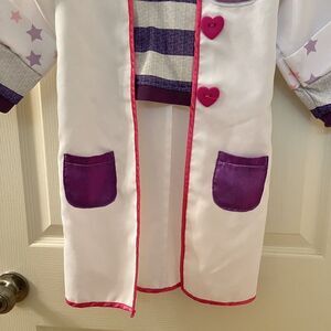 Disney Store Doc McStuffins Doctor Coat Costume Dress Up Girls Size 5/6. This costume from the Disney Store did originally come with other pieces, but this is for the white doctor coat only. Adorable little dress up doctor coat with what looks like a built-in striped top, heart button details and Doc McStuffins badge attached to the front. Has been worn, but no major issues that I can find to the jacket. Good Used Condition.