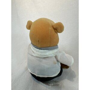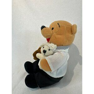 Soft plush toy featuring Doctor Pooh dressed in a white coat with a stethoscope, holding a baby bear and bag. Collectible and adorable.