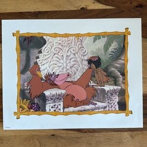 Disney Store Exclusive The Jungle Book lithograph set. Includes 2 sets of 4 prints with bamboo edging and 1 gold stamped commemorative lithograph. Each lithograph measures 11” x 14”.
