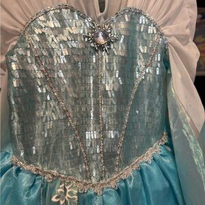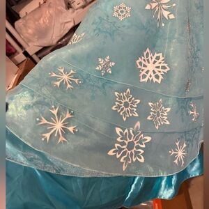 Authentic BEAUTIFUL Disney Store Elsa dress from Frozen. Beautiful icy blue costume with shimmering sequined bodice, snowflake gem detail at the chest, and a sheer white cape overlay. Layered skirt features embroidered snowflakes and soft satin underskirt for fullness.