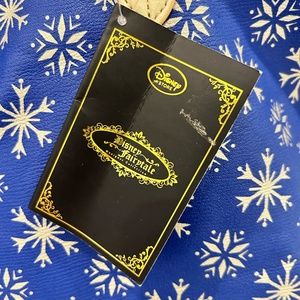 Beautiful blue frozen theme design with gold faux leather trim. Magnetic closure and small feet on bottom of tote.