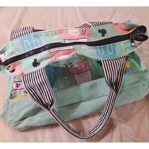 This green canvas tote bag is perfect for any Disney fan who loves Mickey Mouse. The bag features a fun ice cream treats sundae design and a zipper closure. It is a medium-sized bag that can be used for carrying various items such as books, groceries, or even as a beach bag. Clean preowned condition. No rips. Small spot on inside pouch and bottom outside corner. Minor scuffing on bottom corner. Measurement in pictures. Please see all photos