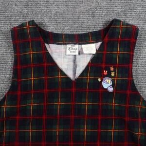Vintage/late-90s Disney Store corduroy jumper in classic holiday tartan with Pooh embroidery at the pocket and a honey pot/bee motif at the chest. Soft fine-wale cord, side-button closures, and two front pockets—easy to layer over tees or turtlenecks. Color may vary slightly from photos due to lighting and monitor settings.