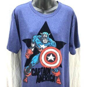 A men's size large shirt from The Disney Store MARVEL. The shirt is in shades of blue, black, red and white with Captain America graphics and velvet star. The shirt is t-shirt style, crew neck, short sleeves and is in excellent pre-owned condition.