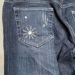Silver Sparkly, embroidered and embellished. Perfect combination on dark jeans! Two of the ‘diamonds’ appear to have been glued back on. Rest are sewn on. Perfect for your next trip to the Magic Kingdom or around town showing your favorite mice!
