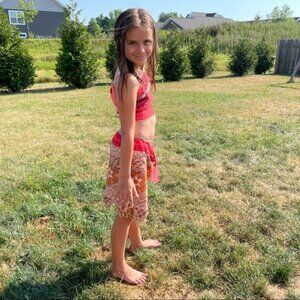 Details: Top is a tube style pullover, it does have two clear invisible straps (One is no longer attached fully), it has a half Velcro back for an easy way to get in. Bottoms are elastic waist, and have a faux belt. Some fringe on the bottoms of the skirt.