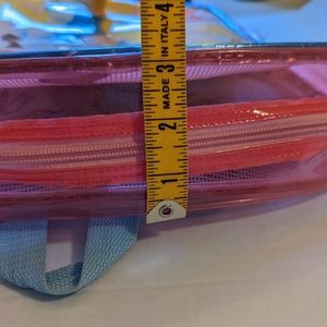This princess backpack was sold exclusively by the Disney Store around 2003. It has pink transparent vinyl sides, a mesh front and back, and a vinyl pocket. The pocket features Sleeping Beauty (Aurora,) Cinderella, and Belle.