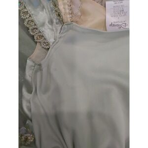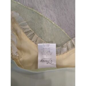 Disney Store Princess Tiana costume dress captures the enchanting style of The Princess and the Frog. This authentic roleplay gown features a shimmering green satin bodice with elegant gold trim and a large white fabric flower at the waist. The multi-layered skirt includes a sheer organza overlay and a cream-colored base adorned with glittery gold floral embroidery and swirling vine details. Designed with ruffled cap sleeves and a comfortable elasticized back, this dress is perfect for dress-up, Halloween, or a trip to the parks.