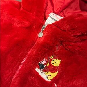 Adorable vintage Disney Store red jacket featuring embroidered Winnie the Pooh and Eeyore designs. Super soft and cozy—perfect for any nostalgic Disney fan or little one with big style!