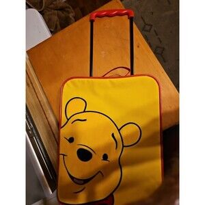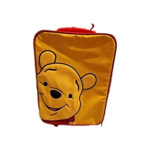 Adorable vintage Disney Store rolling suitcase featuring Winnie the Poohs plush/appliqué face on a bright yellow front panel with red trim. Soft-sided body with zip closure, two wheels, and pull handle. Kid-size carry-ongreat for overnight trips, theme-park travel, or as a cute storage piece. Interior Disney Store tag present (see photos).