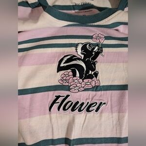 Disney striped t-shirt featuring a flower graphic. Pink, white, and green stripes.