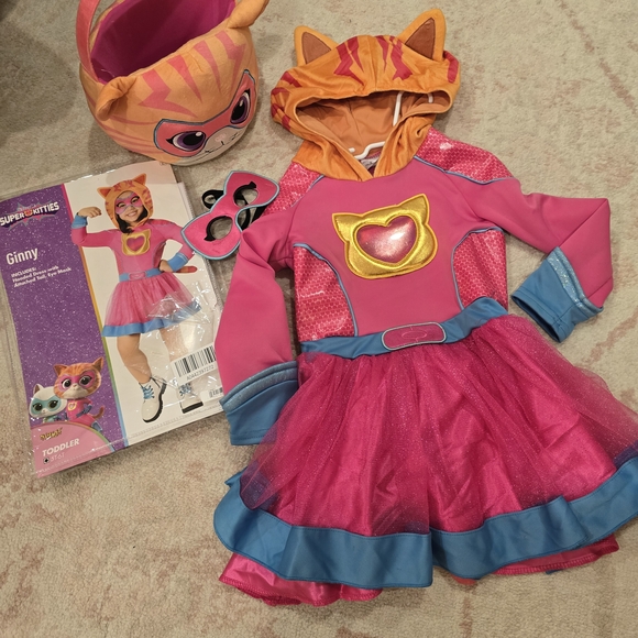 5T-6T Disney Super Kitty Costume, includes hooded dress with attached tail, eye mask and treat bucket. worn once. Bucket was $20, costume $40 when bought new. Still in excellent condition for another round of trick or treating or wear for pretend adventures!