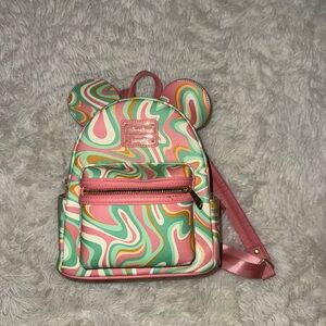 Brighten up your day with this colorful Disney mini backpack. Featuring a vibrant swirl design in pink, green, and orange, it's perfect for any adventure. You’re Disney ready!