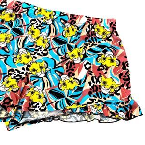 Disney's the Lion King ruffle hem shorts features Simba against a vibrant blue and pink background with scattered animal print.