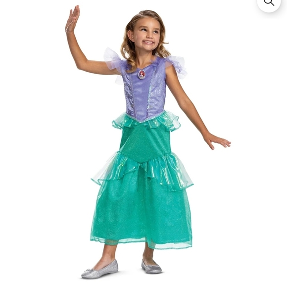 The product is a Disney The Little Mermaid Ariel Girls Costume Dress in size small (6/6X). It is made of polyester material and features a colorful multi-color design inspired by the popular Disney theme, The Little Mermaid. This dress allows young girls to dress up as their favorite animated character and is perfect for special occasions or everyday imaginative play.