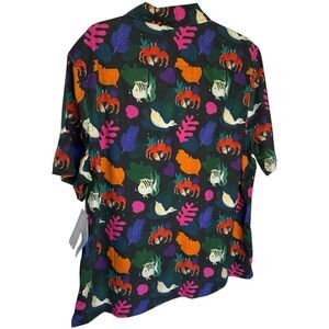 This woven shirt features a tropical plant pattern with Sebastian, Flounder and Scuttle as seen in Disney's live action film. Button front, collar and side vents make it something to see from under the sea.
