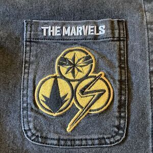 Features pre washed denim, 2 chest pockets,chest pocket features embroidered Captain Marvel, Ms Marvel & Monica Rambeau symbols.