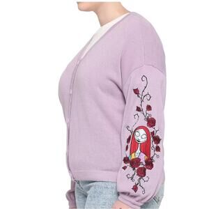 This purple The Nightmare Before Christmas cardigan is perfect for keeping you warm on your graveyard date! It features embroidery detailing on the sleeves of Jack and Sally framed by roses and vines. Front button closure.
