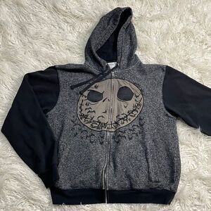 Disney The Nightmare Before Christmas Jack Skellington Hoodie, Adult Size M. This full-zip hoodie features a unique Jack Skellington graphic with bat details. Made of a comfortable cotton blend in a heather grey and black colorway. Excellent pre-owned condition, no stains or holes. Perfect for fans of the classic Tim Burton film or those looking for unique streetwear.