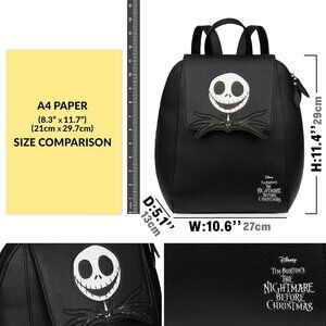 Features: Adorable rectangular faux leather backpack featuring Jack Skellington graphics. Adjustable straps, multiple interior pockets, water-repellent, and easy to wipe clean. Compact yet spacious with a 5L capacity, ideal for daily essentials like phone, wallet, and small accessories. Zipper closure for security.