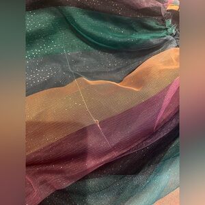 Charming Disney costume with a multicolor patchwork design. Features vibrant panels of black, green, purple, and orange. Perfect for Halloween fun.