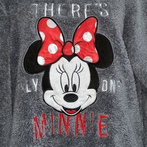 Disney gray fake fur sweatshirt with “There’s Only One Minnie” & Minnie Mouse’s face embroidered on front
