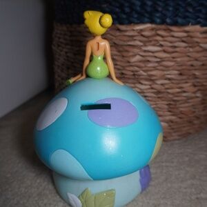 Disney Tinker Bell Sitting On A Mushroom Vinyl Piggy Bank Collectors No Plug. This Piggy Bank Is well loved and preowned with signs of use such as color fade and missing plug but still looks in decent condition.