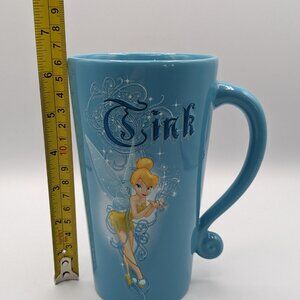 Part of the Fairies collection, this tall Tinkerbell 3D ceramic mug is approximately 6.25 inches in blue. Designed with a scroll handle for easy holding, it has been used only for display and is in excellent condition.