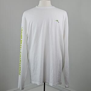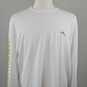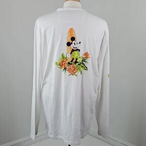 Happiest Surf On Earth Lux Long Sleeve T-Shirt from Tommy Bahama and Disney collaboration. Features a mix of beautiful embroidery and screen print design on the back with Mickey Mouse in a Hawaiian surfing motif.
