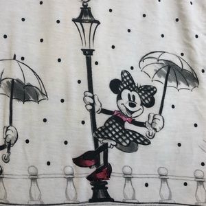 Short Sleeve Disney Parks Shirt White with Black Polka Dots Mickey and Minnie Along the Bottom Hem with Light Posts and Bridges with Red Intertwined