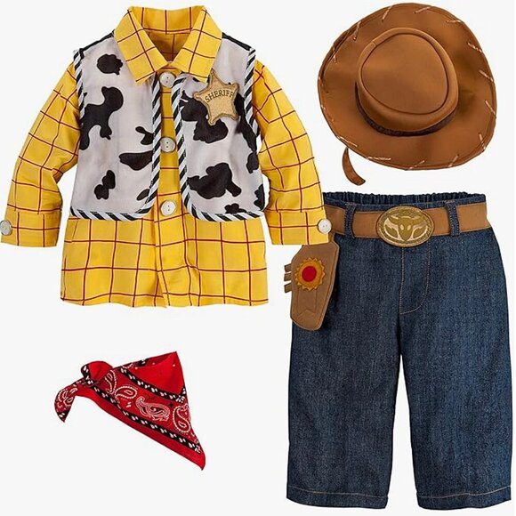 Woody Costume Set: This authentic Disney baby costume includes pants, shirt, vest with Sheriff badge, hat, and bandana. Perfect toddler Halloween costume for a fun Halloween party or toddler dress up.