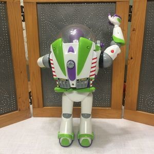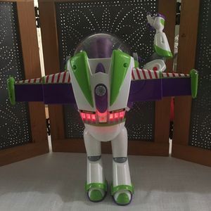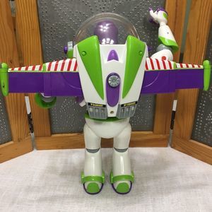 Featuring more than 10 phrases, plus laser lights, Buzz starts speaking when he detects another interactive character nearby. Press button for wing release and activate flashing laser lights Press blue, red and green buttons on front to hear 10+ phrases including arm laser button for laser light and sound effects button on wings to activate Buzz's arm karate chop button to retract helmet Pre Owned Condition in very good condition see all picture works well. Non Smoking home