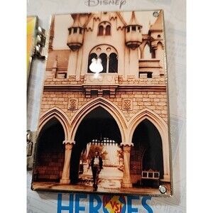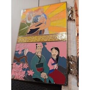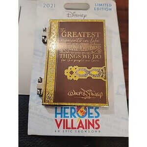 This hinged pin from the Heroes vs Villains Pin Event features a book where the inside cover (left) has Hercules with Zeus and Hera; and Mulan with her father. The right side has an archival photo, Walking in Walts Footsteps in front of Sleeping Beauty Castle.