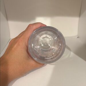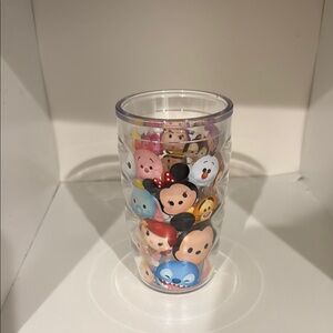 Clear tumbler featuring Disney Tsum Tsum characters. Comes with a black lid.