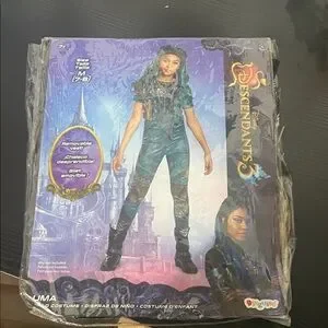 Official Disney Descendants Uma costume. Teal jumpsuit with black accents and boots. Includes removable vest shown on packaging.
