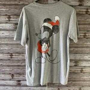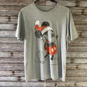 This Unisex Short-Sleeved Tee by Disney is a Size L and is made of 60% Cotton and 40% Polyester. It is a heathered gray in color with a distressed Christmas themed Mickey Mouse Graphic on the front and the back as shown. Gently used. Great Condition!