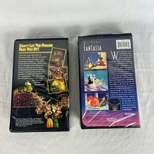 Lot of 2 vintage Disney VHS tapes - includes Fantasia and The Disneyland Main Street Electrical Parade Farewell Season. Both untested but appear in good shape, one clamshell case is squished and one label is coming off the vhs tape.